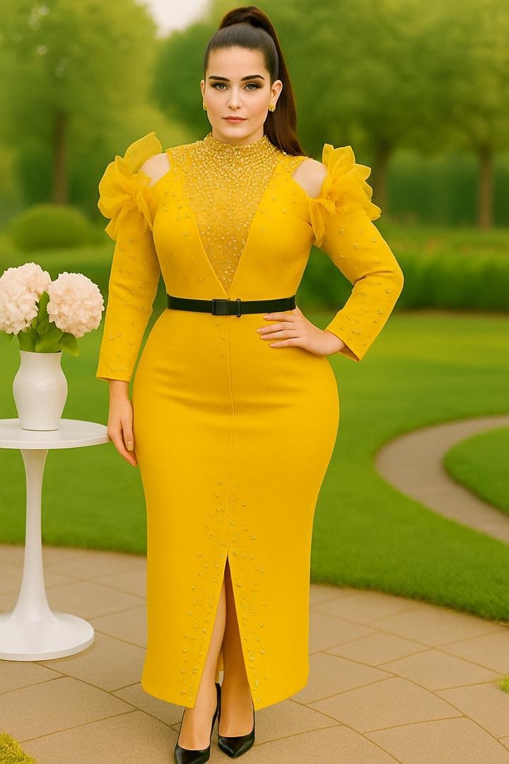Este vestido comprido amarelo combina elegância e sofisticação, com uma racha subtil na parte frontal que valoriza a silhueta, mangas compridas e abertura nos ombros que adicionam um toque moderno e delicado. Feito com tecido confortável e fluido, é perfeito para jantares, festas de gala ou ocasiões especiais, transmitindo charme e presença marcante.